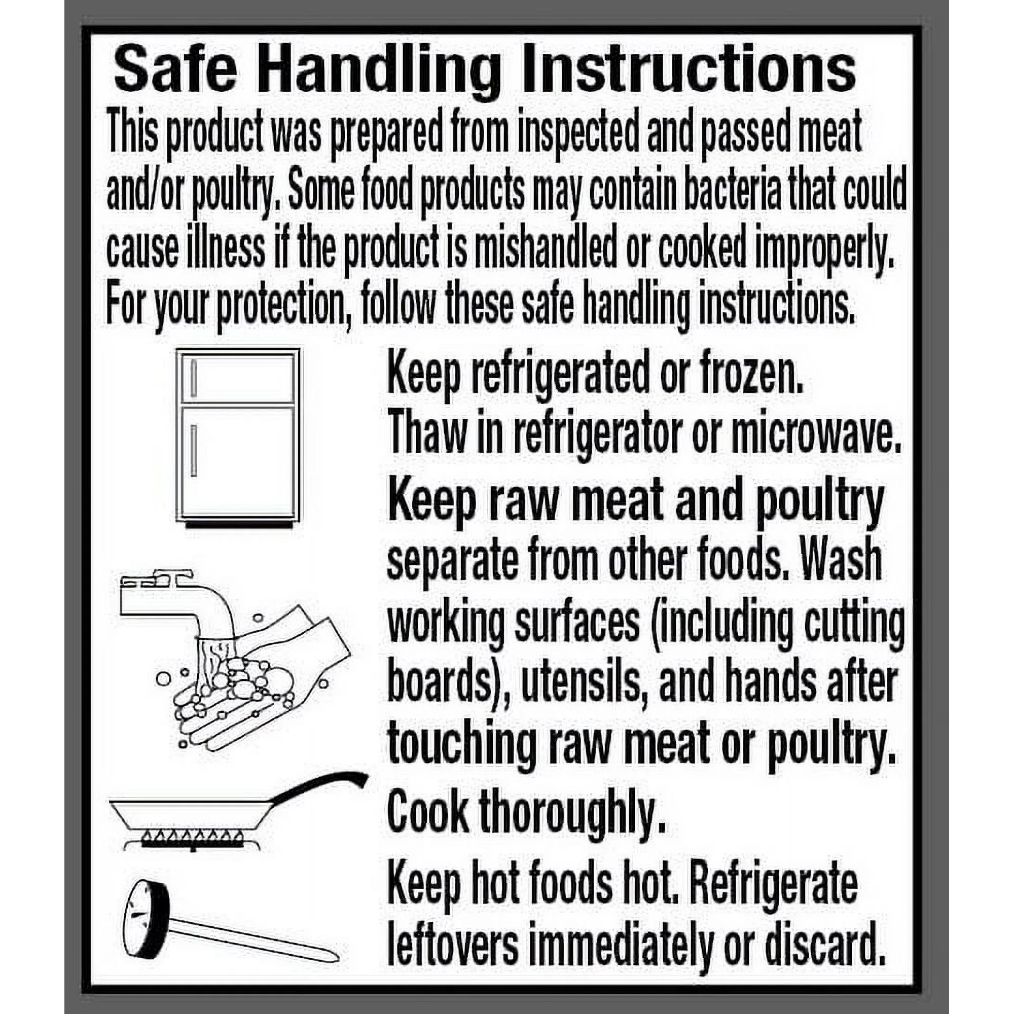 This product was prepared from inspected and passed meat and/or poultry. Some food products may contain bacteria that could cause illness if the product is mishandled or cooked improperly. For your protection, follow these safe handling instructions. Keep refrigerated or frozen. Thaw in refrigerator or microwave. Keep raw meat and poultry separate from other foods. Wash working surfaces (including cutting boards), utensils, and hands after touching raw meat or poultry. Cook thoroughly. Keep hot foods hot. Refrigerate leftovers immediately or discard.Warranty