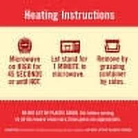 Cooking Instructions – General – Cover. Stir before serving. As all microwave ovens vary, times given are approximate. Microwave – From Ambient – Heating Directions: Remove metal lid under plastic cover; replace plastic cover. Microwave on High for 45 seconds or until hot. Let stand for 1 minute in microwave. Remove from microwave by grasping container by sides. Do not lift by plastic. Oven cook – From Ambient – For Convenience Store (1700 Watt). Microwave on High for 30 seconds.Safe Handling Instructions