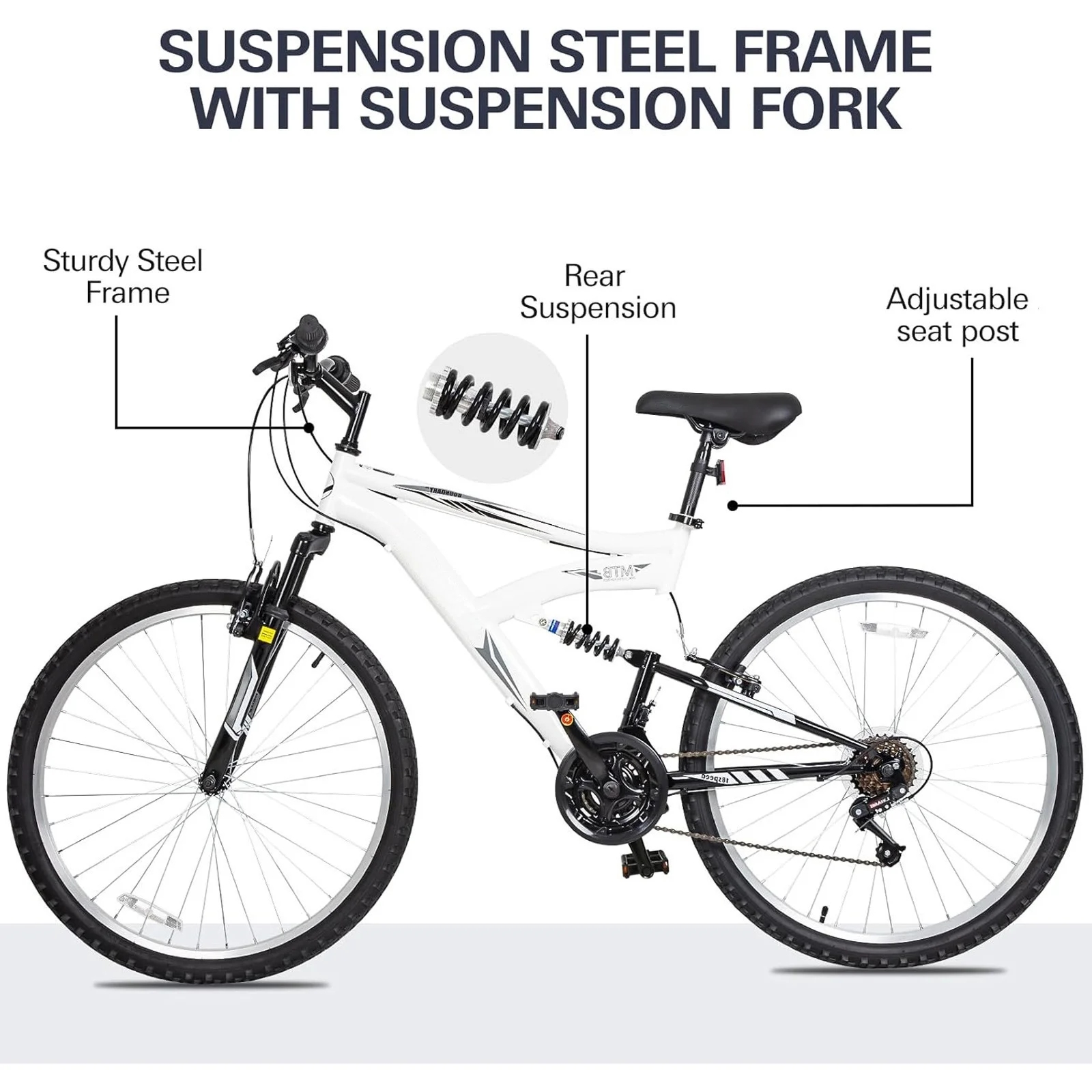 - Superior Control & Comfort: Features 18-Speed gearing for diverse terrains, Full Suspension with a mid-shock absorber for smooth rides, and reliable V-Brakes for consistent stopping power.